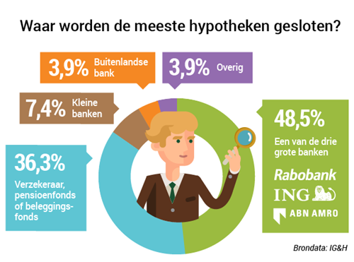 De laagste hypotheekrente vind je al lang niet meer bij een bank. Andere partijen zoals pensioenfondsen, beleggingsfondsen en verzekeraars zorgen voor de concurrentie op de hypotheekmarkt. Banken hebben het nakijken en dat blijft waarschijnlijk nog wel even zo. Door strenge regels zullen banken opnieuw duurder worden, verwacht onderzoeksbureau IG&H.