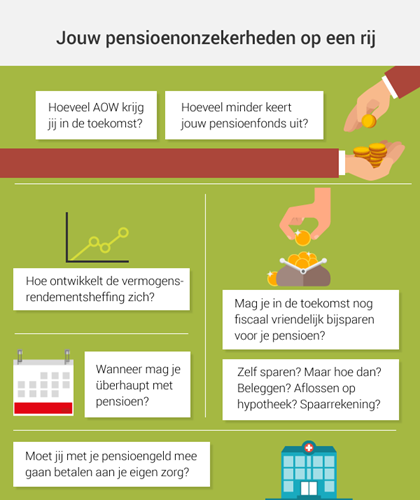Ons zorgstelsel wordt een steeds grotere kostenpost voor de overheid. De eerste politici hebben al geroepen dat mensen met een hoger vermogen meer zelf mee moeten gaan betalen aan hun eigen zorg. Ofwel: als je extra spaart voor je pensioen, of als je jouw hypotheek volledig aflost en jouw huis dus een deel van je pensioengeld is, kan het zijn dat je daardoor in de toekomst juist extra moet gaan betalen.