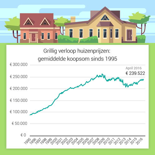 Door zelf de ontwikkeling huizenprijzen zo nu en dan in de gaten te houden, zie je of jij je huis hebt gekocht óf wilt gaan kopen op een moment dat de prijzen in verhouding relatief laag óf juist hoog zijn. De grilligheid lijkt daarbij iets op de beleggingsmarkt. Vooraf weet je nooit 100% zeker of je op een piek of in een dal zit.