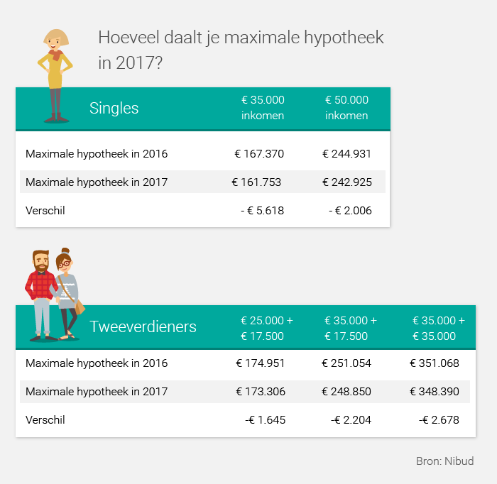 Hoewel budgetvoorlichter Nibud anders beweert, daalt volgend jaar de maximale hypotheek. Een single starter met een inkomen van €35.000 leent vanaf volgend jaar ruim €5.500 minder. Voor tweeverdieners is de daling van de leencapaciteit iets minder groot. De keuzevrijheid van single starters neemt steeds verder af.