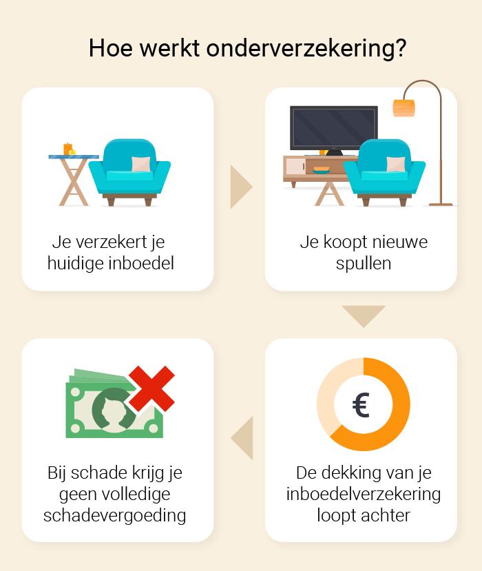 Van onderverzekering is sprake als het verzekerde bedrag lager is dan de werkelijke waarde van je inboedel. Het kan ook voorkomen bij andere verzekeringen, bijvoorbeeld de uitvaartverzekering of overlijdensrisicoverzekering.