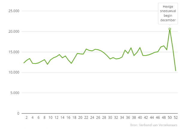 In 2017 is er relatief weinig sprake geweest van noodweer. Harde regen, sneeuw en wind leiden doorgaans tot meer aanrijdingen. De cijfers van het Centrum voor Verzekeringsstatistiek (CVS) tonen bijvoorbeeld een piek in december vorig jaar, toen er een flink pak sneeuw viel. In die week lag het aantal claims op de autoverzekering anderhalf keer hoger dan het gemiddelde.