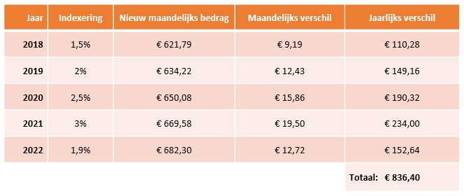 Zeker als betaler van alimentatie is het goed om de verhoging in de gaten te houden. Misgelopen alimentatie kan tot vijf jaar teruggevorderd worden. Hoewel de alimentatie maar met een klein percentage wordt verhoogd, kan dit in op langere duur fors oplopen. Is de alimentatie afgelopen vijf jaar bijvoorbeeld niet geïndexeerd? Dit kan de ontvanger €836,40 aan alimentatie kosten. In onderstaand tabel vind je terug hoe dit bedrag is opgebouwd.