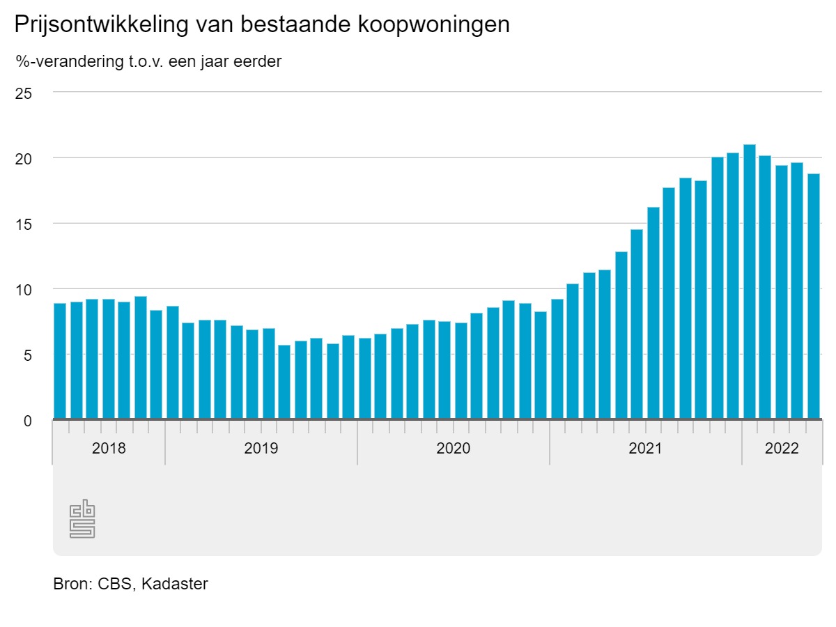 Bestaande koopwoningen zijn in mei 18,8% duurder geworden dan een jaar eerder. Een flinke toename. Zeker als je bedenkt dat tussen juni 2018 en 2020 de prijs op jaarbasis gemiddeld 7,7% steeg. Toch lijkt er intussen een daling ingezet in het percentage waarmee de huizenprijs stijgt. Zo lag in januari dit jaar de jaarlijkse stijging nog op ruim 21%. In mei dit jaar werd een woning voor gemiddeld € 429.000 verkocht.