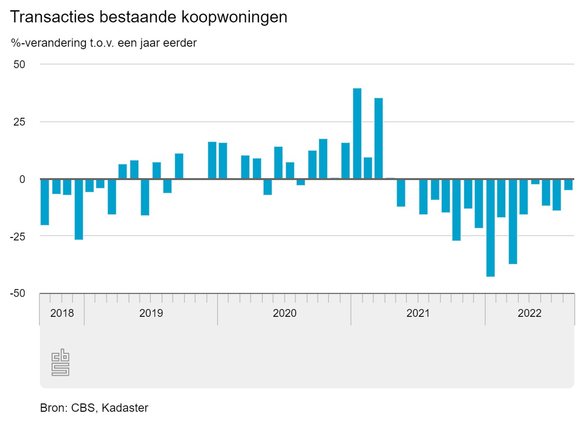 Het Kadaster maakte bekend dat het in augustus 16.405 woningtransacties registreerde. Dat is bijna 5 procent minder dan een jaar eerder. In de eerste acht maanden van 2022 zijn 124.127 woningen verkocht, ruim 20 procent minder dan in dezelfde periode van 2021.